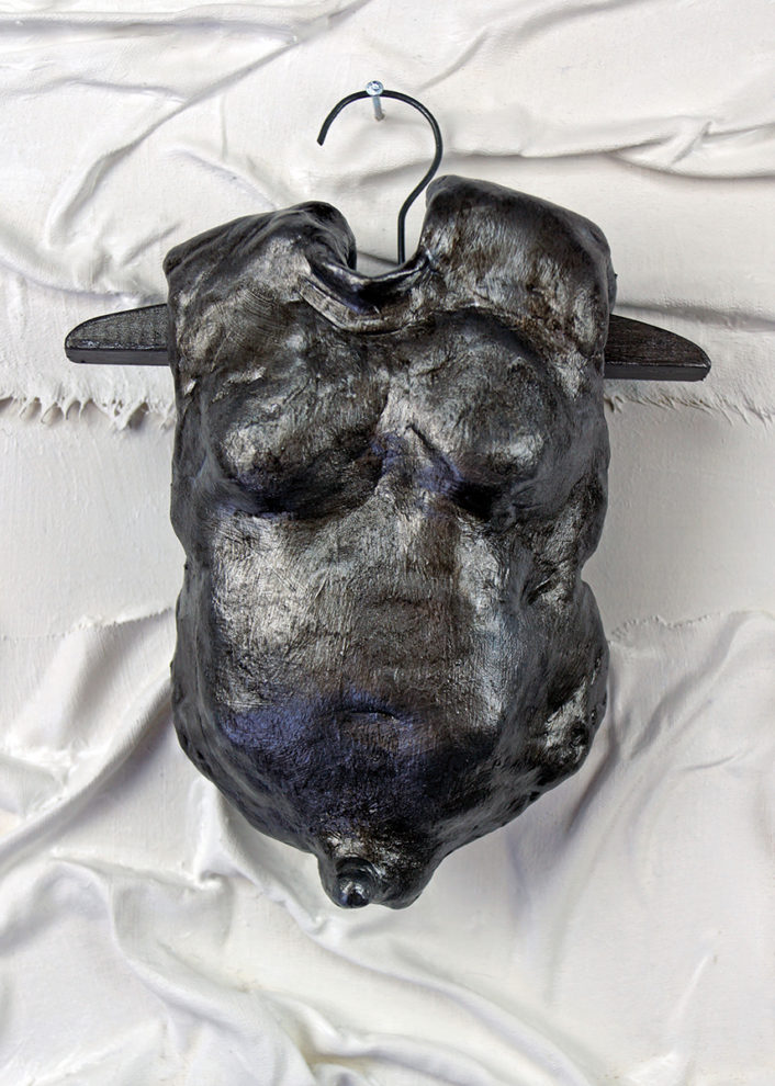 BODYSUIT TORSO #1 2019 - 2024 BODYSUIT TORSO #1 • 2022MIXED MEDIA: RESIN CLAY SCULPTURED TORSO, PAINTED FABRIC, VINTAGE WOOD AND METAL DOLL CLOTHES HANGER, ACRYLIC ON PANELDIMENSIONS:WOOD PANEL •20 INCHES T X 16 INCHES W X 2.5 INCHES DTORSO •5.5 INCHES T X 3 3/8 INCHES W X 2 INCHES DDOLL CLOTHES HANGER • 2.5 INCHES T X 5 INCHES W X .25 INCHES D